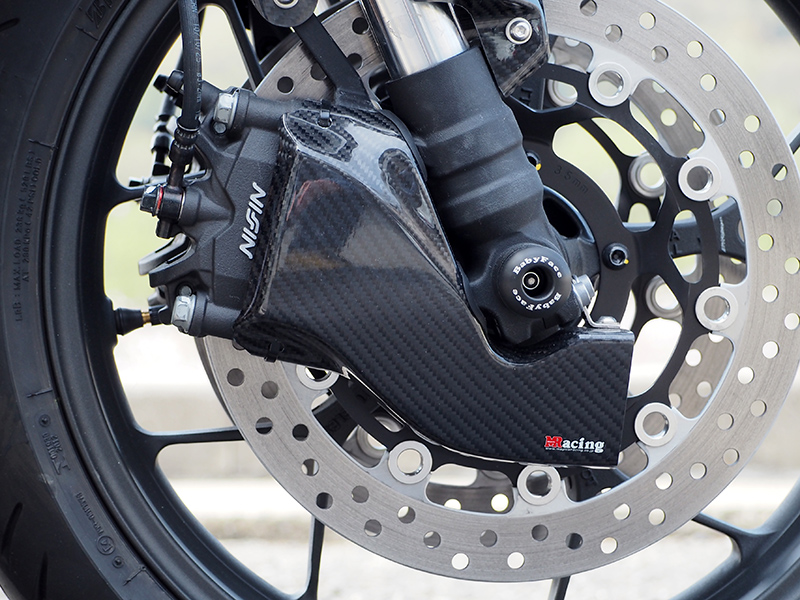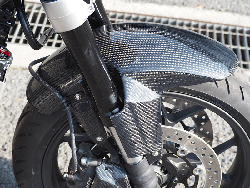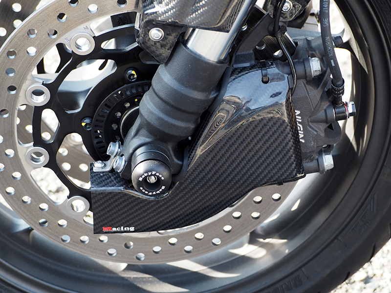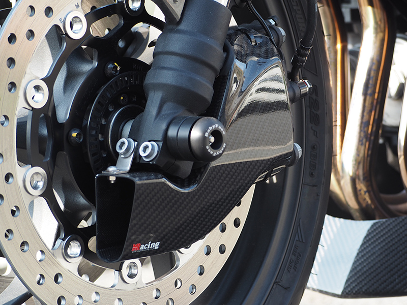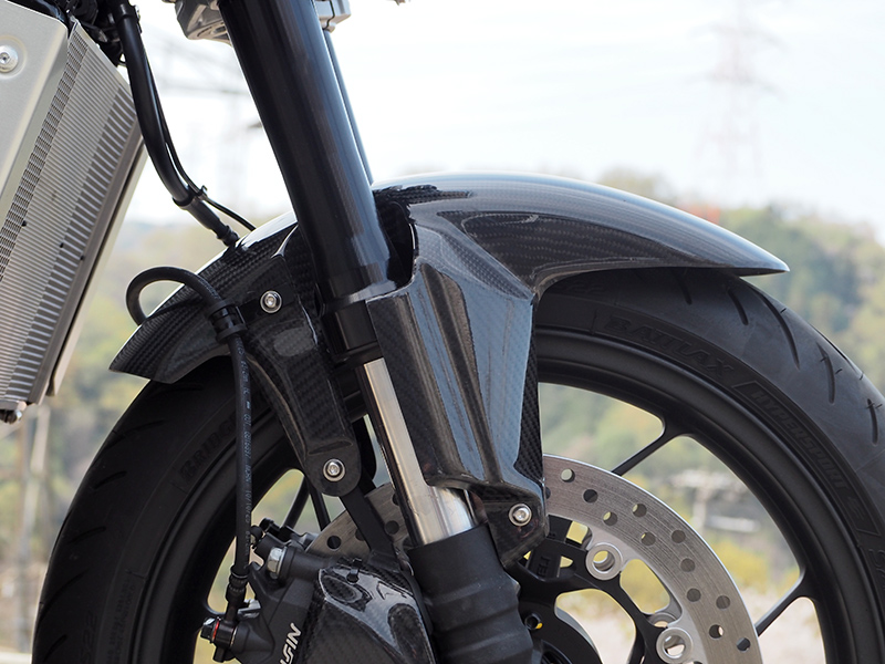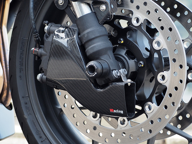 フォークガードを一体形状にすることにより、飛び石などからフロントフォークのインナーチューブを守ります。